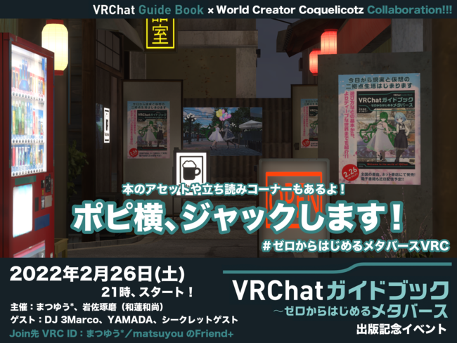 ワールドクリエイター・コクリコさんとのコラボレーションにより、書籍でインタビューさせていただいたゲストをお迎えしてVRChat内の人気ワールド「ポピー横丁」で出版記念パーティーを行います。