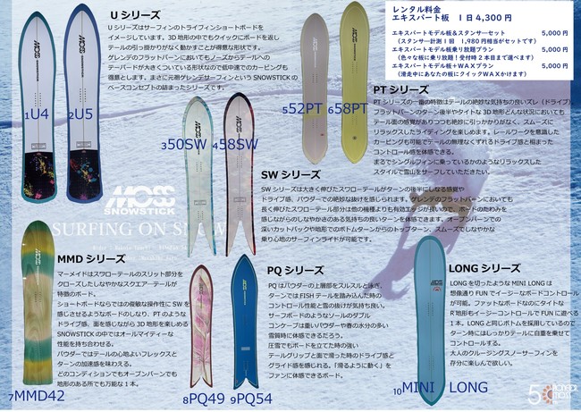 ライブ感、パウダースノーでの絶妙な抜け感を感じられ、上質なパウダースノーが降雪する同リゾートではおすすめです。ほかにもUシリーズから PT・ MMD・ PQ・ LONGシリーズまで幅広いエキスパートレンタルをご用意しております。