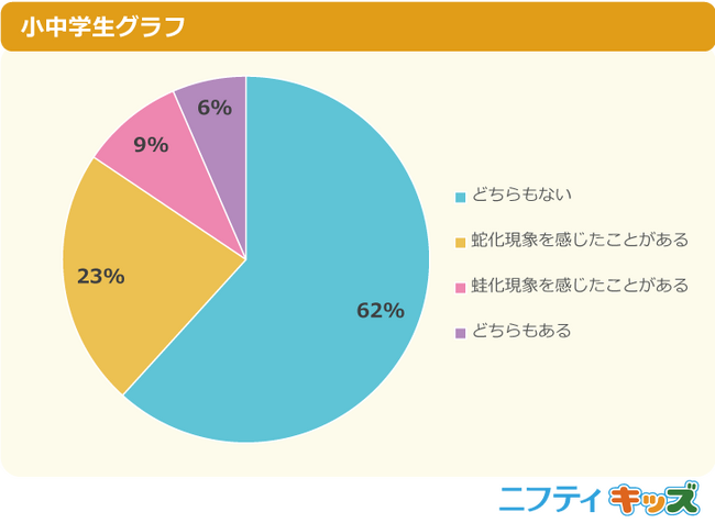 62%の子どもたちが「どちらもない」と答えました。蛇化現象を感じたことがある人は23%、蛙化現象を感じたことがある人は9%で、「どちらもある」と回答した人もいました。