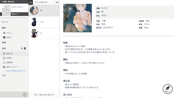 合わせて「Nola」では物語に登場する人物の名前、年齢、性格、見た目、生い立ち、能力・スキル、などのキャラクター設定を管理する行うこともできます。