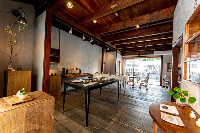 江戸初期より続く地域の伝統産業、萩焼深川窯の器を気軽に楽しめるお店として、温泉街の片隅に2017年夏にオープンしました。手づくりながらシックな色調の店内は、程よく日常から切り離してくれます。店奥のテラス席は温泉街の中心を流れる音信川にせり出す形で設置しております。器は萩焼深川窯の若手作家によるものをセレクトしてあり、入口付近のギャラリースペースでは器の展示、販売も行っております。