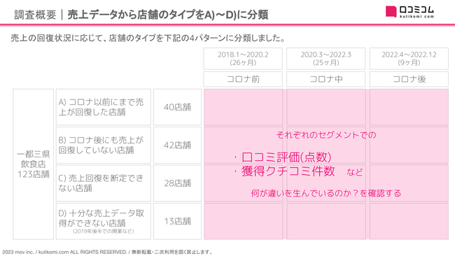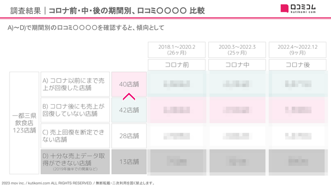 コロナ前、中、後の期間別に「コロナ以前にまで売上が回復した店舗」「コロナ後にも売上が回復していない店舗」を比較しました。