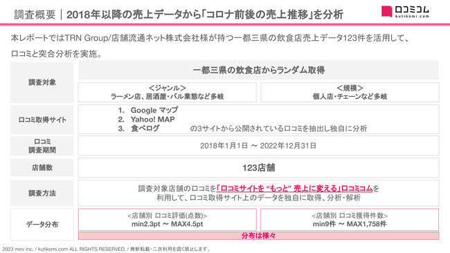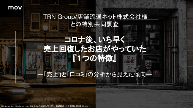 口コミサイトを”もっと”売上に変える店舗支援SaaS「口コミコム」を運営する株式会社mov(代表取締役:渡邊 誠、本社:東京都渋谷区、以下mov)は、TRN Group/店舗流通ネット株式会社様が持つTRN Group/店舗流通ネット株式会社様が持つ一都三県の飲食店売上データ123件を活用した口コミ分析を実施しました。