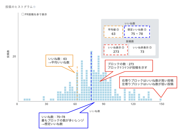 投稿を「いいね数」を基準にヒストグラムに分布して表示