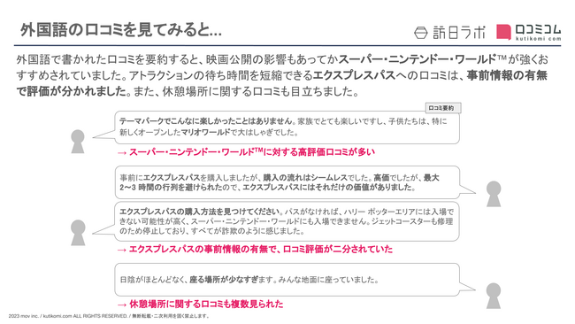 外国語で書かれた口コミを要約すると、映画公開の影響もあってかスーパー・ニンテンドー・ワールド(TM)が強くおすすめされていました。