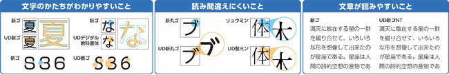 「文字のかたちがわかりやすいこと」「文章が読みやすいこと」「読み間違えにくいこと」をコンセプトに開発されています。具体的には、濁点、半濁点を大きくして、区別をつけやすくしているほか、シルエットの似た文字を判別しやすくするために、はなれを明確にするなどの工夫がされています。