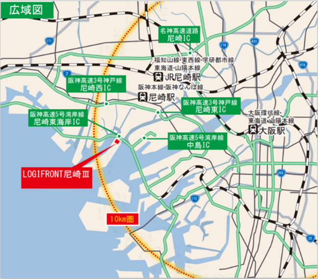 さらに、工業専用地域で物流倉庫として優れた操業環境であることなどに着目し、近畿圏全体を網羅する広域配送の物流拠点とすべく、「LOGIFRONT」シリーズとして、本物件とともに「LOGIFRONT尼崎II」、「LOGIFRONT尼崎IV」の計3施設の開発を一体的に進めてきました。