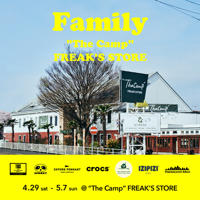 FREAK'S STOREの本店である古河市の"The Camp"FREAK'S STOREにて、ゴールデンウィークを家族で楽しめる体験型イベント「Family」を開催します。ここでしか買えない限定アイテムだけでなく、テントサウナ体験やワークショップなども実施。"The Camp"FREAK'S STOREでしか体験できないモノ・コトをご用意しております。