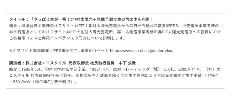 PV EXPO 2020ビジネス戦略セミナーに代表の木下が登壇〜非FIT太陽光+発電予測で“生”の再エネ利用を提案〜