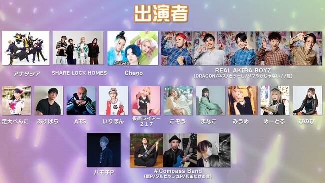 7周年を記念する今回の「#コンパスフェス」では、会場を巡ってスタンプを集めるとグッズがもらえるスタンプラリーや、「リアルURカード」などのノベルティ配布、メディアミックスプロジェクトの原画やアニメ新情報を展示するブースが新たに設けられます。出演者は、アナタシアやSHARE LOCK HOMESなどのお馴染みのメンバーに加え、新ヒーロー「クー・シー」のモーションアクターを担当する人気踊り手のAMUが出演します。