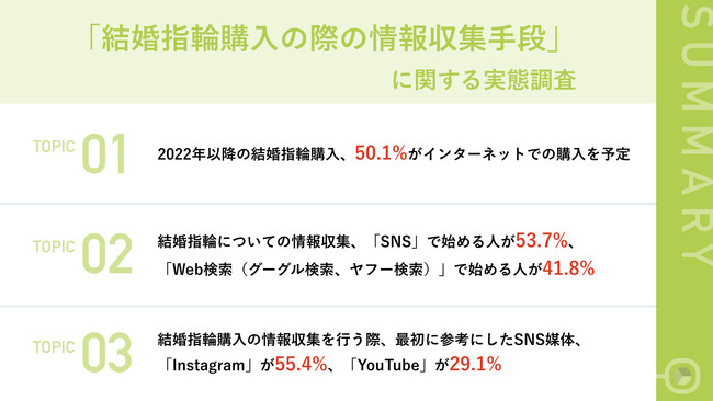 今回の調査では、結婚指輪をインターネットで購入することが珍しくなくなってきたことや、購入に際しての情報収集にはSNSとWeb検索の両方を使う人が多いことがわかりました。様々な媒体から情報を集めることで、より納得感のある購入につなげようとするニーズがあるようです。