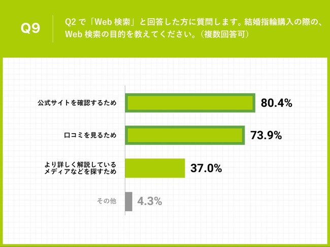 「Q9.Q2で「Web検索」と回答した方に質問します。結婚指輪購入の際の、Web検索の目的を教えてください。(複数回答可)」(n=46)と質問したところ、「公式サイトを確認するため」が80.4%、「口コミを見るため」が73.9%、「より詳しく解説しているメディアなどを探すため」が37.0%という回答となりました。