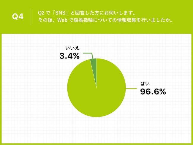 「Q4.Q2で「SNS」と回答した方にお伺いします。その後、Webで結婚指輪についての情報収集を行いましたか。」(n=59)と質問したところ、「はい」が96.6%、「いいえ」が3.4%という回答となりました。