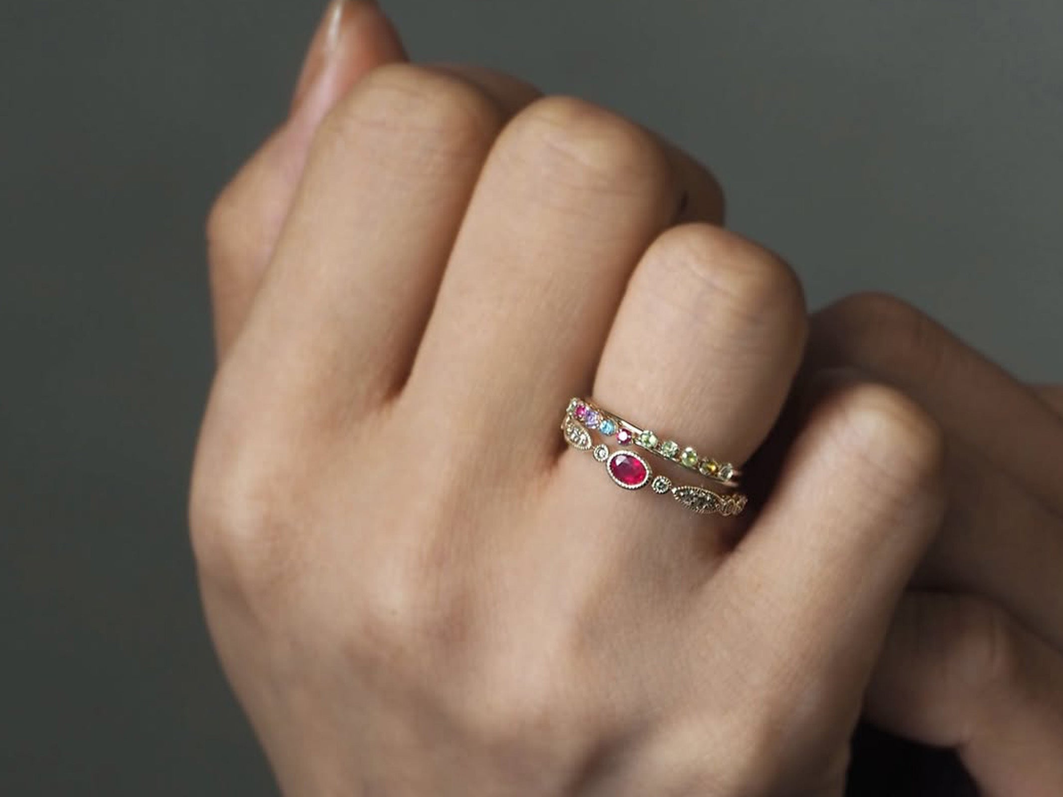 細身のアームに5ピースの宝石を端正に配したLuce。すっきりとした佇まいのなかに、それぞれの色が軽やかなリズムを奏でるリングです。
