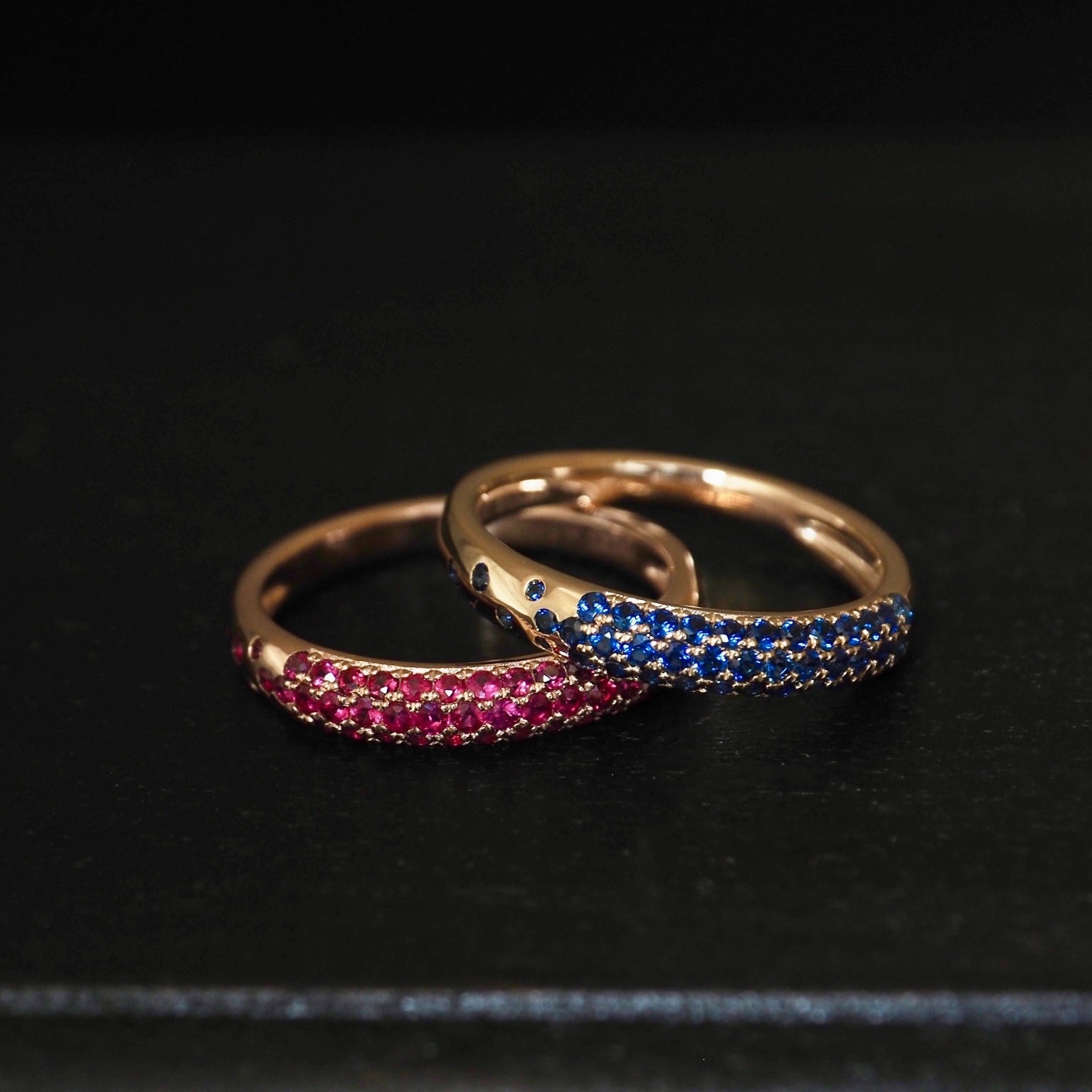 ルビーには、肌になじみやすいK10ピンクゴールドを合わせ、やわらかな艶を引き出しております。ブルーサファイアは、K10イエローゴールドとホワイトゴールドの2種類をご用意し、合わせる地金によって青の見え方にわずかな違いが生まれ、表情に奥行きをもたらします。