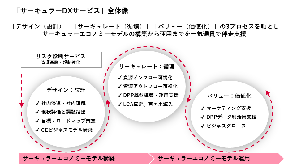 - - デジタル製品パスポート(DPP)対応のデジタル基盤の構築や循環プロセスで得られるデータ活用など、サーキュラーエコノミー移行へ向けたDX推進を支援