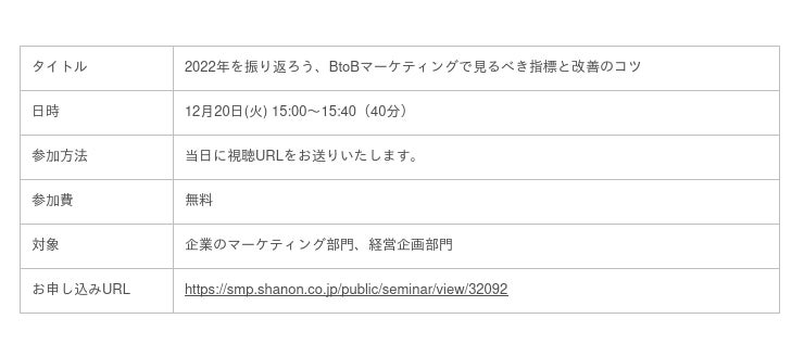 株式会社シャノン(本社:東京都港区、代表取締役社長:中村 健一郎)は、BtoBマーケティングの施策を効果的に振り返るための指標と改善のコツについてご紹介するウェビナーを12月20日(火)に開催します。