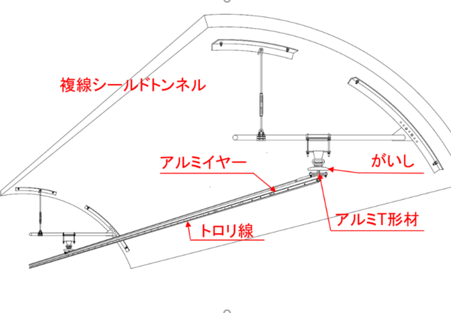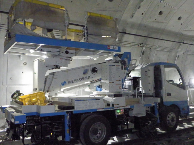 令和4年1月から、新横浜トンネル(新横浜駅(仮称)〜新綱島駅(仮称))内において、バイオ燃料を使用した高所作業車を用いて、電車に電力を供給するための電車線設備の取付け作業を行っています。