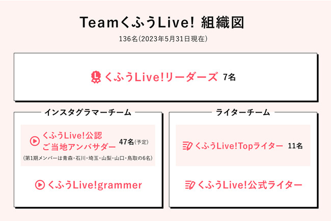「くふうLive!」を一緒に作る「TeamくふうLive!」は、メディアやSNSにおいて大きな影響力を発揮する「くふうLive! リーダーズ」、Instagramで最新トレンドを発信する「くふうLive! grammer(くふうライブグラマー)」、くらしに役立つ記事を発信する「くふうLive! 公式ライター」の3つのチームで構成されます。