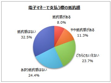 直近1年間に店頭で電子マネー払いをした人に、利用した電子マネーのタイプを聞いたところ、「カード型」が65.8%、「クレジットカード一体型」が31.9%、「携帯電話・スマートフォンの機能・アプリ」が18.5%となっています。電子マネーを店頭で利用することに抵抗を感じない人は56.9%、男性30・40代では6割を超えます。