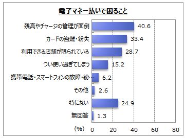 ■店頭での電子マネー払いで困ることは「残高やチャージの管理が面倒」が最多、「カードの盗難・紛失」「利用できる店舗が限られている」が続く