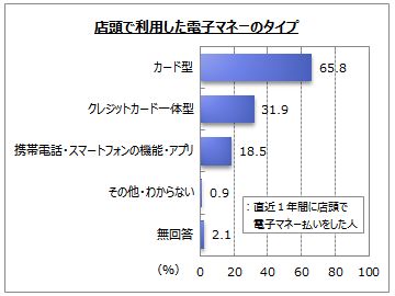 ■直近1年間に店頭で電子マネー払いをした人は5割弱。利用したタイプは「カード型」が7割弱、「クレジットカード一体型」が3割強。店頭で利用することに抵抗を感じない人は6割弱