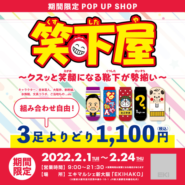 オリジナル商品の企画・制作・販売を軸に、企業・組織のトータルブランディングを手掛ける株式会社ヘソプロダクション(本社:大阪市福島区・代表取締役:稲本ミノル)は、2022年2月1日(火)〜 2月24日(木)の間、JR新大阪駅在来線改札内 エキマルシェ新大阪「EKIHAKO」にて、クスッと笑顔になる靴下が大集合するポップアップショップ「笑下屋(くすしたや)」を期間限定オープンいたします。