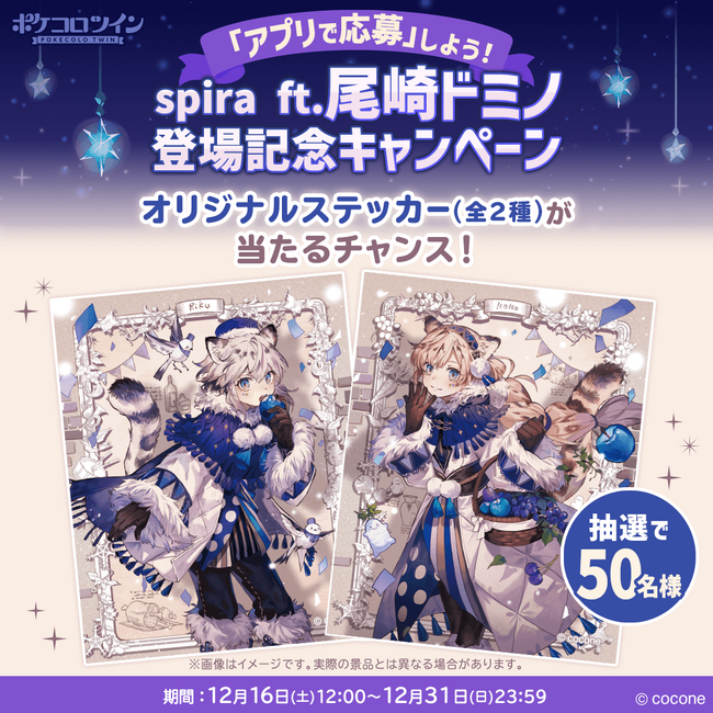尾崎ドミノさん描き下ろしのキービジュアルを使用したオリジナルステッカー2種を、抽選で50名様にプレゼントします。『ポケコロツイン』のアプリ内から応募できますので、この機会にぜひ遊んでみてください。