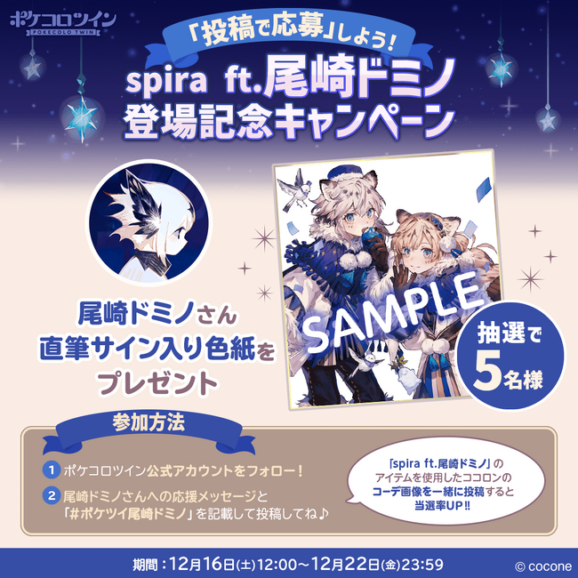 『ポケコロツイン』公式のXアカウント(@PokecoloTwin)をフォローし、尾崎ドミノさんへの応援メッセージを指定ハッシュタグと合わせて投稿すると、尾崎ドミノさん直筆サイン入り色紙を抽選で5名様にプレゼントします。