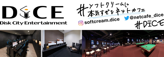 「DiCE」 は、2000 年より関東を中心に展開しているインターネットカフェです。高級感や清潔感などから、多くの女性のお客様にもご好評を得ています。豊富な雑誌・コミック、フリードリンクに加え、ソフトクリームに関しては「ソフトクリームに本気すぎるネットカフェ」として毎月違う味の提供や、他社とのコラボも行っています。