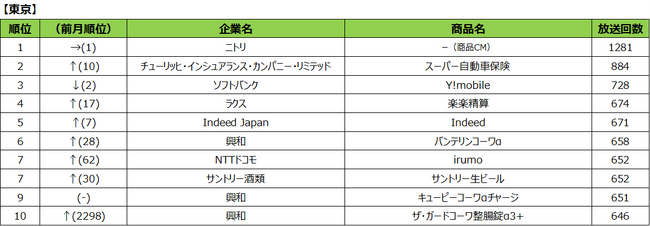 2023年7月度の商品別ランキングは、1位にニトリの商品CM、2位にサントリー酒類「サントリー生ビール」、3位にソフトバンク「Y!mobile」となりました。ニトリの商品CMは、4か月連続で1位となりました。