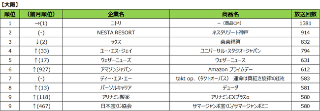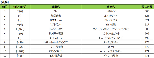 また、各地区のランキング上位に、その付近のレジャー施設のCMがランクインしました。ユー・エス・ジェイ「ユニバーサル・スタジオ・ジャパン」は、大阪地区で4位、名古屋地区で1位でした。大阪地区ではNESTA RESORT「ネスタリゾート神戸」が2位、札幌地区では加森観光「ルスツリゾート」が2位にランクインしました。