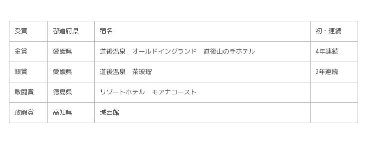 「楽天トラベルアワード2015」は、取扱額やお客さまの評価などを総合的に評価し決定する「総合部門」と、各項目で飛躍的な実績をあげた宿を表彰する「個別部門」の2部門にて発表いたします。四国地区では、以下の20宿が受賞し、そのうち7宿が初受賞となりました。発表内容は以下の通りです。