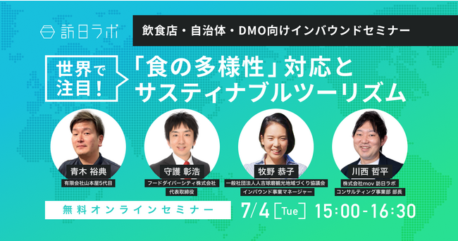 国内最大級インバウンドメディア『訪日ラボ』を運営する株式会社mov(代表取締役:渡邊 誠、本社:東京都渋谷区、以下mov)は、飲食店・自治体・DMOのマーケティング・集客ご担当者様向けに「世界で注目!「食の多様性」対応から実践するサスティナブルツーリズムとは?」と題したセミナーを開催します。日時は7月4日(水)15:00〜16:30、参加費は無料です。