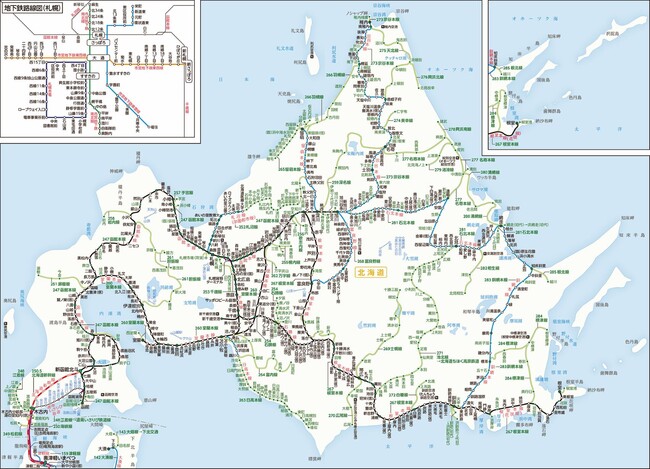▲『JTB時刻表』2022 年 10 月号の索引地図上に 廃線や貨物線も加えて、全路線を視覚的に調べやすい