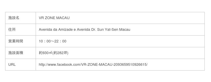 株式会社バンダイナムコアミューズメント(本社:東京都港区、社長:萩原仁)は、2019年12月18日(水)、Macau Fisherman’s Wharf International Investment Limited(マカオ フィッシャーマンズ ワーフ インターナショナル インベストメント リミテッド)(Palace Building, Macau Fisherman’s Wharf, Avenida da Amizade e Avenida Dr. Sun Yat Sen, Macau)が運営するVR施設において、中国マカオ特別行政区でのVR事業を開始しました。