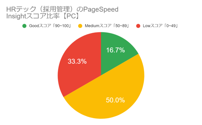 以下は、PageSpeed InsightsのAPIを使用し、トラベルテック業界12サイトのページ表示速度について調査した結果です。黄色で表示されるMediumスコアの比率が50.0%、赤色で表示されるLowスコアが33.3%、ページスピードの改善がほぼ必要ないGoodスコアが16.7%という結果でした。