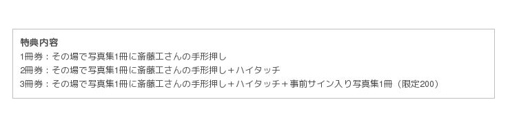 本イベントでは、イベント参加対象書籍『斎藤工×LESLIE KEE SUPERフォトマガジン「JOURNEY」』(以下「写真集」と表記)の購入冊数(1〜3冊の3種類)によって、下記特典が受けられます。