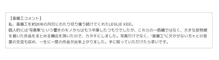 俳優デビュー前で、モデルとしてもまだ無名だった斎藤に注目したのが、シンガポールから来日して間もない、駆け出しの写真家だったレスリー氏だった。以来、事あるごとにレスリー氏自身の作品撮りや雑誌での撮影、斎藤が出演・監督した映画のオフィシャルスチールを担当するように。そんな2人の20年間にわたる軌跡が、この一冊に全て詰め込まれている。さらに、今作のために特別に撮り下ろした最新ショットも掲載。