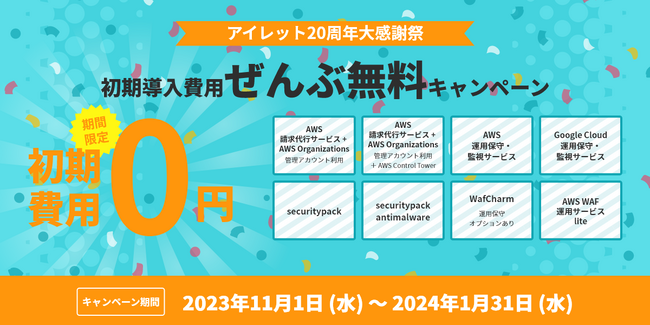設立20年の節目を迎えた今回、お客様へ感謝の気持ちを込めて、アイレットが提供する運用保守・セキュリティ関連サービス8種の初期導入費用が無料となる「初期導入費用ぜんぶ無料キャンペーン」を実施します。