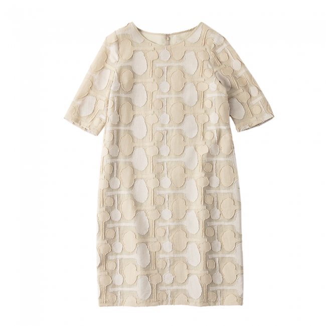 大小さまざまに並んだスプーン柄をカットジャカードで表現したテキスタイル。何気ない日常にあるモチーフを取り入れた楽しい柄となっています。コットンとレーヨンの違いで表現したスプーン柄の色変化が特徴です。肌馴染みの良いベージュとネイビーのカラー展開となっています。