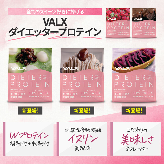 「前例のない熱狂を、しかける。」をミッションに掲げるレバレッジは、ダイエット中でも甘いスイーツが食べたいという声にお応えして、VALXダイエッタープロテインから抹茶ぜんざい風味、モンブラン風味、紅芋タルト風味を新発売しました。