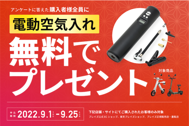 EVモビリティメーカーの株式会社ブレイズ(愛知県名古屋市、代表取締役:市川秀幸)は、令和4年9月1日(土)から9月25日(日)の期間、電動バイク「ブレイズスマートEV」または「ブレイズEVスクーター」をご購入後、アンケートにお答えいただいたお客様へ「電動空気入れ」をもれなくプレゼントいたします!