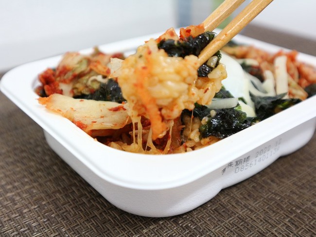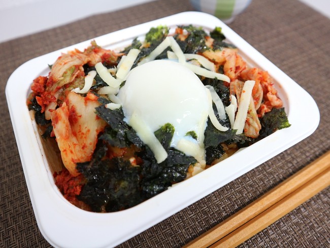 韓国のりの香ばしさと、コチュジャンのコクが口の中いっぱいに広がり、一気に韓国気分が盛りあがります。伸びるチーズがなんとも食欲をそそり、甘さと辛さが絶妙な『VLルーさんの甘辛キムチ』と好相性。食べる際には、半熟たまごを割って、軽く混ぜて食べるとぐっとマイルドに。韓国のりは、たっぷりと入れるとさらに風味がアップします。