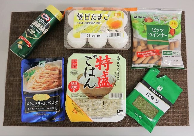 パルメザンチーズ 80g(本体価格375円/税込405円)/たまご 6個/VLビッツウインナー 96g/VL魚介のクリームパスタ 160g/北アルプス国内産特盛ごはん 300g/VLパセリ 4g(各・本体価格100円/税込108円)
