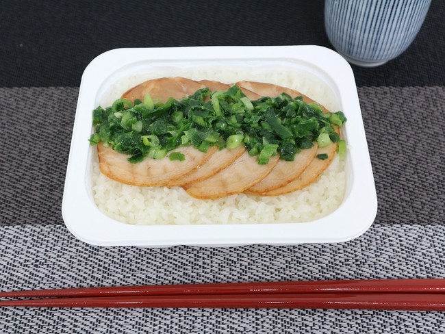 3:温め終えた『特盛ごはん』の上に、『VLバラチャーシュー』をすべて並べて、その上から2で作ったねぎダレをかける