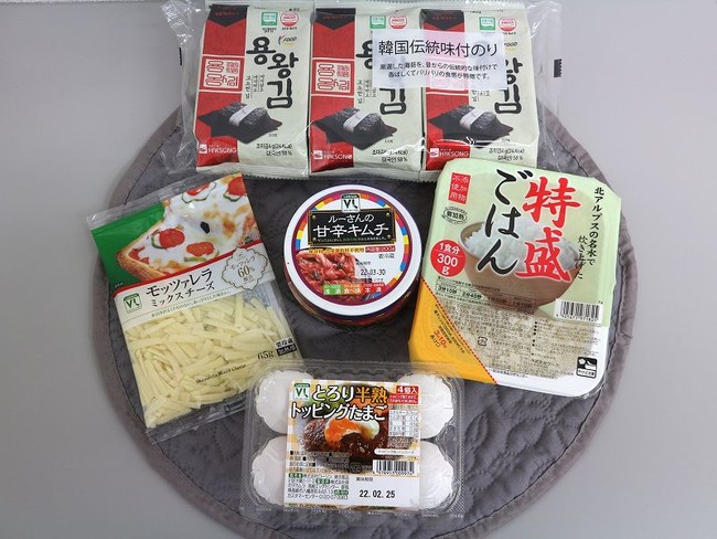 韓国のり 8切8枚3袋/北アルプス国内産特盛ごはん 300g/VLとろり半熟トッピングたまご 4個/VLモッツァレラミックスチーズ 65g/VLルーさんの甘辛キムチ 200g(各・本体価格100円/税込108円)