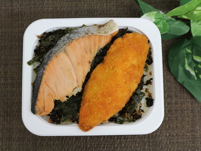 3:封から出した『鮭塩焼き』と、『VL白身魚フライ』をごはんの上にのせ、ふんわりラップを掛ける