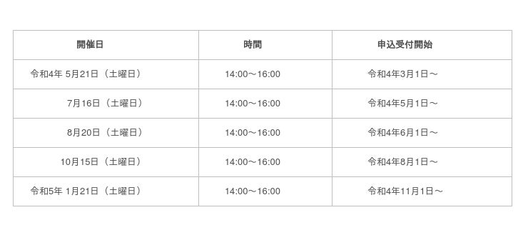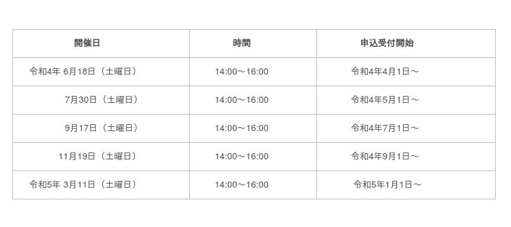 各開催日の2か月前の月の1日から各開催日の2週間前までに,申込フォーム又は電話からお申込みください。