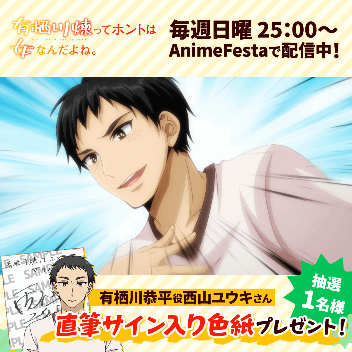 AnimeFesta公式Xアカウント(@AnimeFesta_Info)をフォローし、対象の投稿をリポストしていただいた方の中から抽選で各1名様に、出演キャストの直筆サイン色紙をプレゼントします。本キャンペーンは全6弾。第1弾は有栖川恭平を演じた西山ユウキさんです。